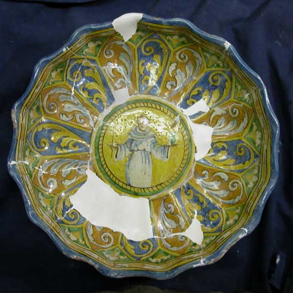 L'oggetto ci è pervenuto frammentato, malamente incollato e con diverse lacune, anche importanti. Si è proceduto allo scollaggio completo e alla ripulitura di ogni singolo pezzo dai residui della precedente incollatura. Restauro mimetico.